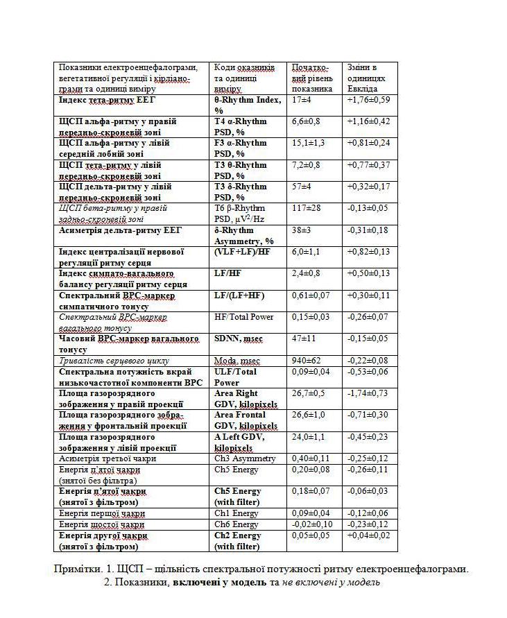 | Показники електроенцефалограми, вегетативної регуляції і кірліано-грами та одиниці виміру | Коди оказників та одиниці виміру | Початко-вий рівеньпоказника | Зміни в одиницях Евкліда |