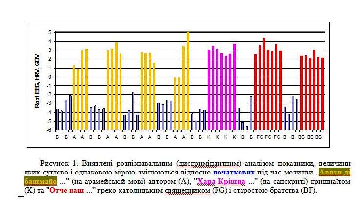 Отримані цифрові показники були оброблені на комп’ютері за спеціальною програмою розпізнавального аналізу, яка виявила з-поміж біля двох сотень зареєстрованих 16, за сукупністю яких стан учасників експерименту до і під час молитви суттєво відрізняється. Інформація про ці показники сконцентрована у так званому розпізнавальному корені і унаочнена на рисунку. Кожен стовпець відображує 25-секундний запис.