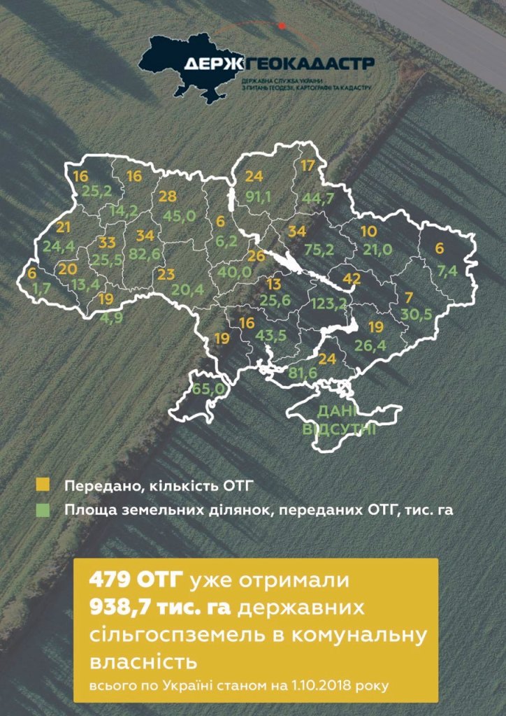 Станом на 1 жовтня 2018 року, 479 об’єднаних територіальних громад отримали у комунальну власність землі сільськогосподарського призначення поза межами населених пунктів загальною площею понад 938,7 тис. гектарів.