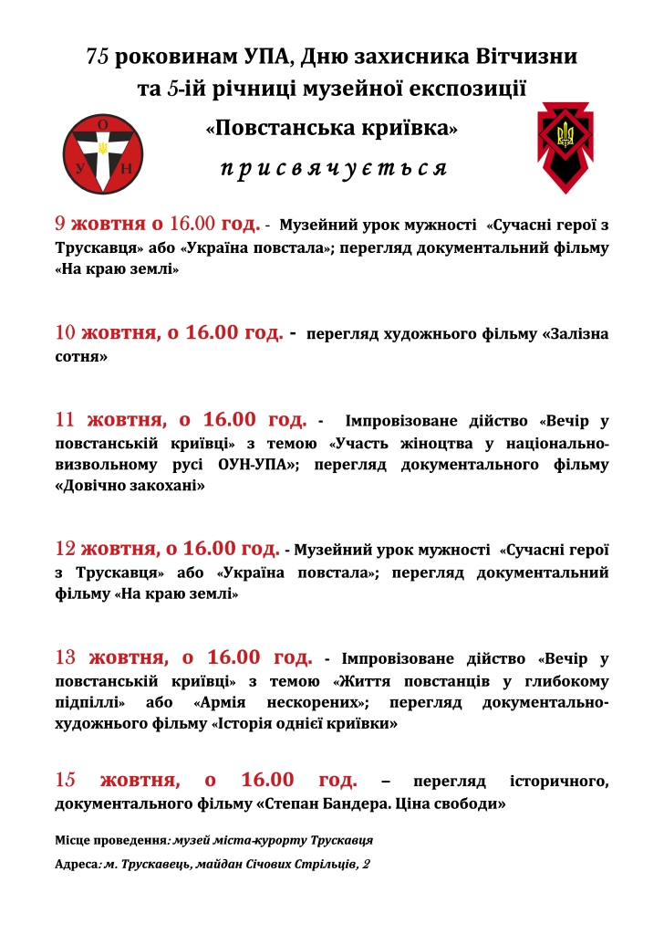 75 роковинам УПА, Дню Захисника Вітчизни та 5 річниці музейної експозиції “Повстанська криївка” присвячується (афіша)