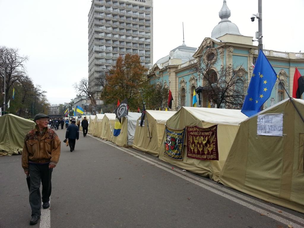 – З Києва я приїхав сьогодні вранці, а за два дні повертаюся туди знову. Це вже пішов четвертий тиждень (з 17 жовтня), як мирні протестувальники організували там два табори. Ці табори стоять неподалік: військовий табір, який організував Рух «Визволення», розташований прямо на вулиці Грушевського, на проїжджій частині, а в частині Маріїнського парку поближче до площі Конституції знаходиться цивільний табір.