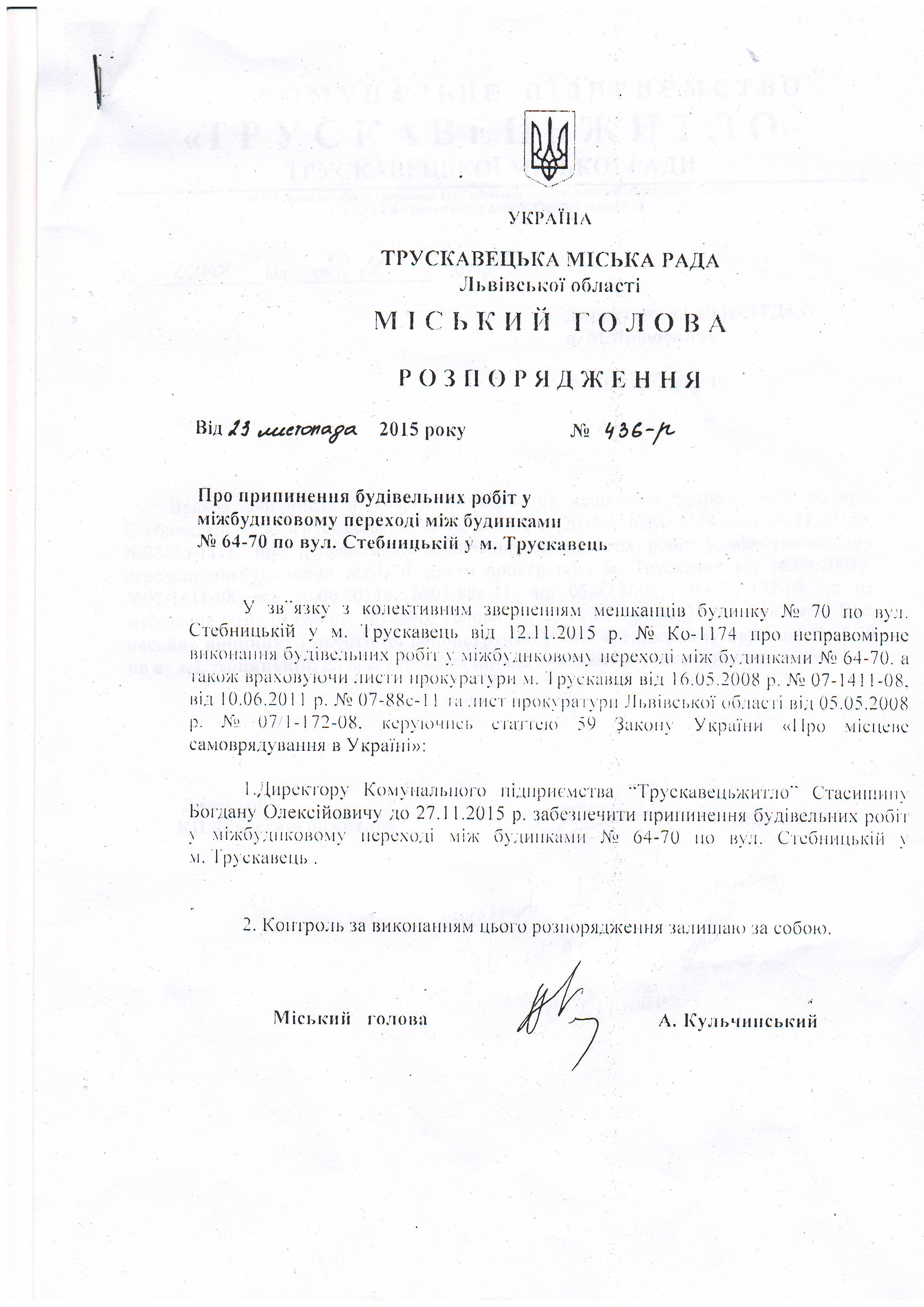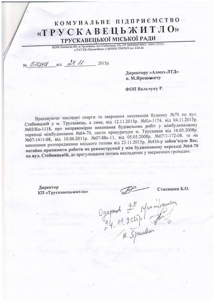 До цієї справи долучився і міський голова міста Трускавець, який своїм розпорядженням (http://protruskavets.org.ua/chomu-ne-vykonujetsya-rozporyadzhennya-miskoho-holovy-a-kulchynskoho/skanyrovat1/) зобов`язав зупинити будівельні роботи, а керівник КП “Трускавецьжитло” розірвав так звану інвестиційну угоду з забудовником, оскільки вона була незаконно підписана і він міг понести за це відповідальність (http://protruskavets.org.ua/protrusk/wp-content/uploads/2015/12/stwal.jpg).