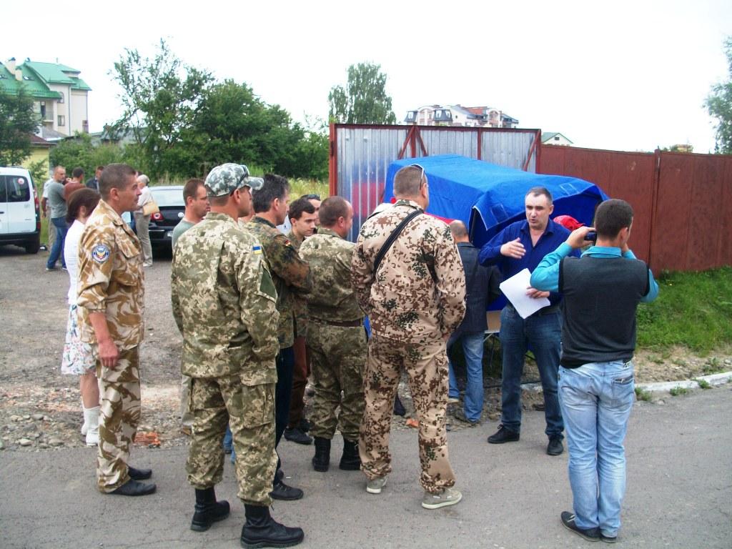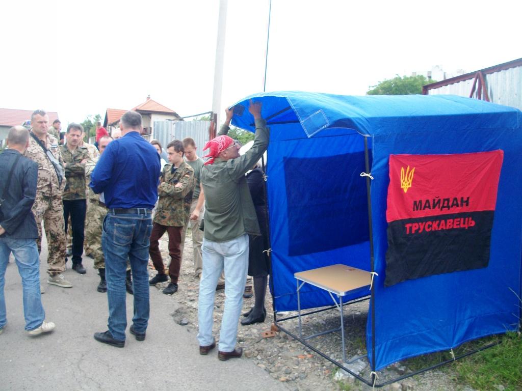 Важко однозначно відповісти на запитання, що ж це було, що ж це за дійство проходило протягом двох годин – мітинг, пікет, з`ясовування стосунків, демонстрація сили, флеш-моб чи щось інше. А виглядало все так. Вже о 11.50 під «Едельвейсом» стояла міліцейська автівка, під брамою розмовляло 7-8 міліціонерів. Під`їхало кілька машин, почали підтягуватися люди. Розкладено палатку синього кольору із прикріпленим написом «Майдан-Трускавець» на бандерівському червоно-чорному прапорі. Слово взяв організатор акції Анатолій Томашівський, який нарешті пояснив, що відбувається. Бо, як виявилося, більшість учасників були повідомлені, що треба прийти, бо «ображають маму воїна АТО», але жодної конкретики ніхто не почув.