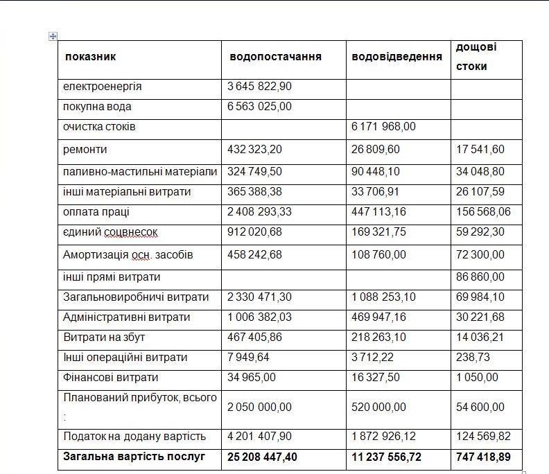 Якщо умовно прийняти, що за період від квітня до липня 2014 року не зростали інші затрати, такі як електроенергія, паливо, зарплата, а лише покупна вода, то в такому випадку середня вартість послуг склала би 11,38 грн за м3, а враховуючи ріст інших затрат вартість послуг водопостачання на 01.07. 2014 року має бути близько 12 грн. за м3.