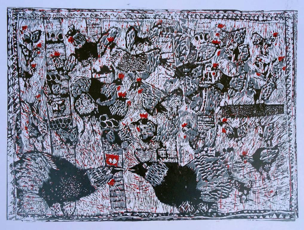 Перший з трьох ліноритів, виставлених на аукціон – це кольоровий лінорит «Когути б’ються за свої кури» 6/50, автор Каміла Шевчик, художній гурток початкової школи в с. Добковіце (Польща). Стартова ціна 2 000 грн.