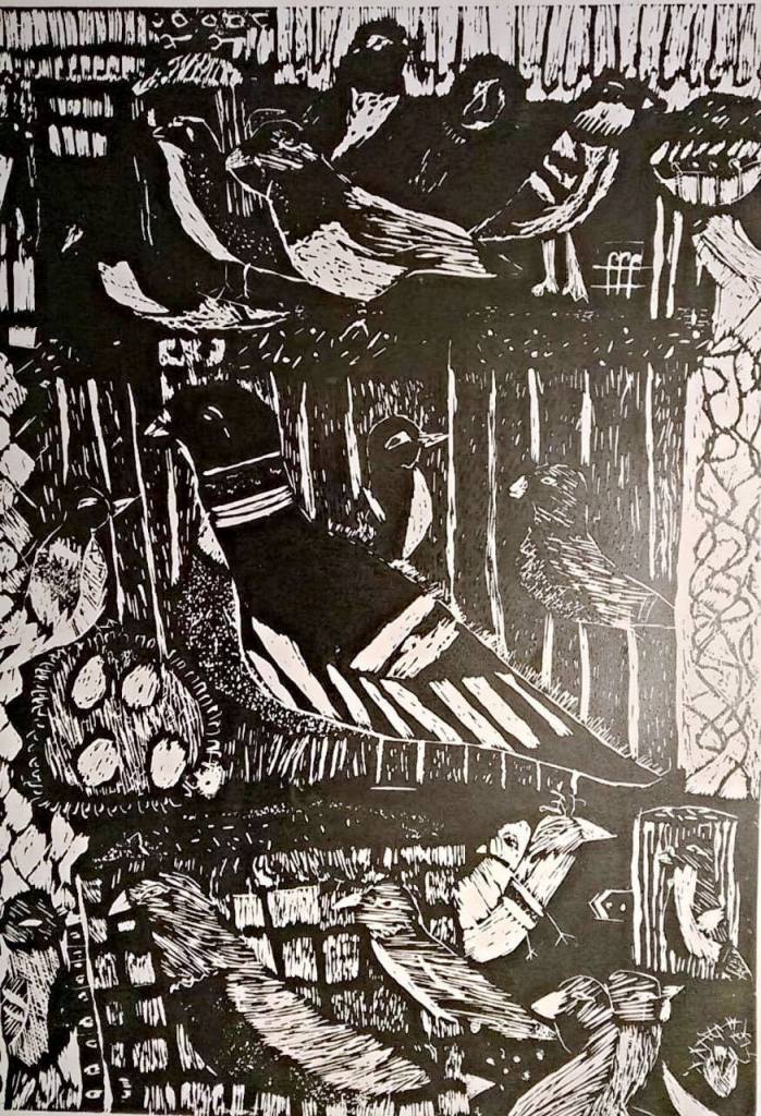 Третій з трьох ліноритів, виставлених на аукціон – це кольоровий лінорит «Голуби», автор Вікторія Корецка, художній гурток початкової школи в с. Добковіце (Польща). Стартова ціна 2 000 грн.