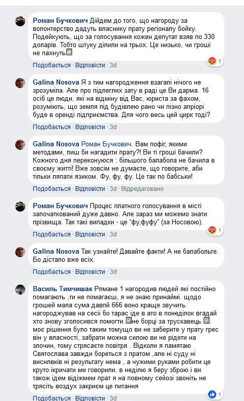 Депутат Василь Тимчишак попросив на комісії з питань регламенту, законності та депутатської етики розглянути поведінку свого колеги, депутата Романа Бучковича (фракція КУН). Причина – коментар Романа Ярославовича на Фейсбуку, розміщений 3 березня стосовно голосування депутатів ТМР. Ось що написав Роман Бучкович у коментарі на сторінці журналістки Ніни Федько (правопис збережено): «Дійдем до того, що нагороду за волонтерство дадуть власнику прату регіоналу бойку. Подейкують, що за голосування кожен депутат взяв по 330 доларів. Тобто штуку ділили на трьох. Це низько, чи гроші не пахнуть?».
