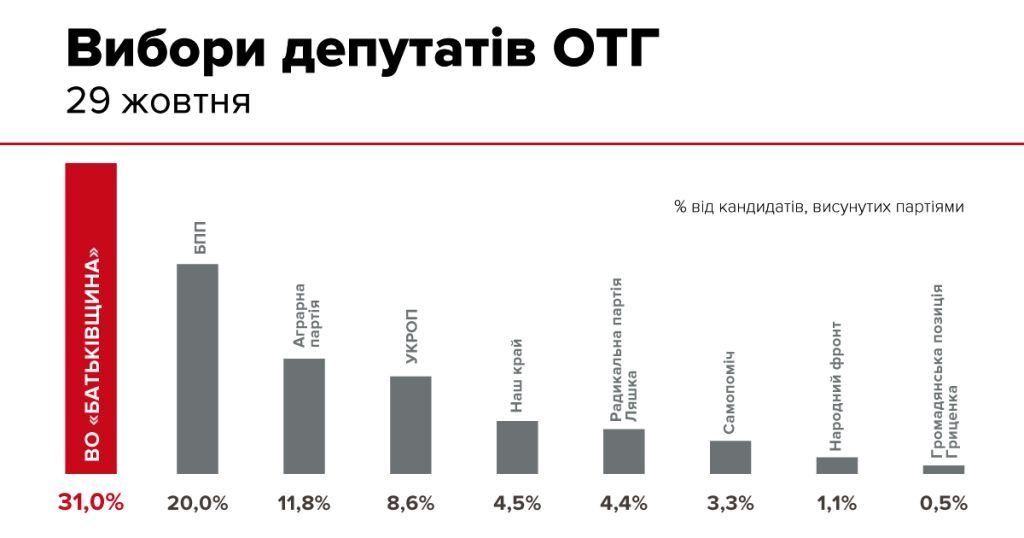 Зазначимо, що згідно з паралельним підрахунком голосів ВО «Батьківщина» по Україні отримала 31% депутатських місць в радах ОТГ, на другому місці Блок Петра Порошенка (20%), а на третьому – Аграрна партія (11,8%).