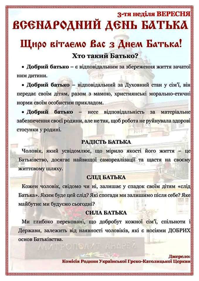 Хоча в світі Міжнародний День Батька відзначають у червні, але в Україні щораз більшої популярності набирає і національне свято Всенародний День Батька. На відміну від традиційного та всім добре відомого Дня Матері День Батька не є аж таким популярним та знаним. А даремно, бо без батька сім`я – неповна, без батька діти не отримують живий приклад для наслідування, без батька все валиться і занепадає. Бо батько – основа і сім`ї, і роду, і держави. Звісно, мається на увазі зразковий батько, а не просто біологічний донор сімені.