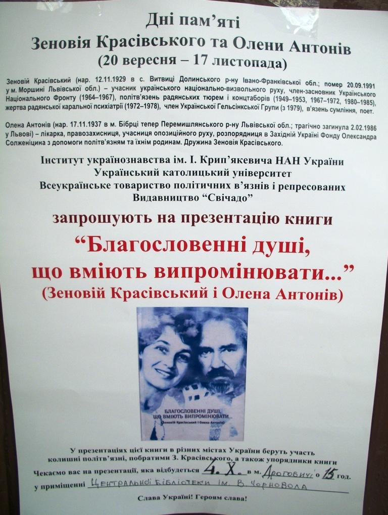 Та повернімося до презентації книги «Благословенні душі, що вміють випромінювати…». Перше її представлення відбулося 12 вересня цього року на Форумі видавців у Львові. Книга присвячена двом непересічним постатям в історії українського національно-визвольного руху ІІ половини ХХ століття – Зеновію Красівському та Олені Антонів. Зеновій Красівський – один із засновників підпільної організації Український Національний Фронт, редактор журналу «Воля і Батьківщина», політв’язень радянських тюрем і концтаборів (1949-1985 рр. з перервами), член Української Гельсінкської Спілки. Олена Антонів – дружина В`ячеслава Чорновола, а згодом дружина Зеновія Красівського, правозахисниця, розпорядник Фонду Олександра Солженіцина в Західній Україні для допомоги політв’язням та членам їхніх родин, опозиційна діячка.