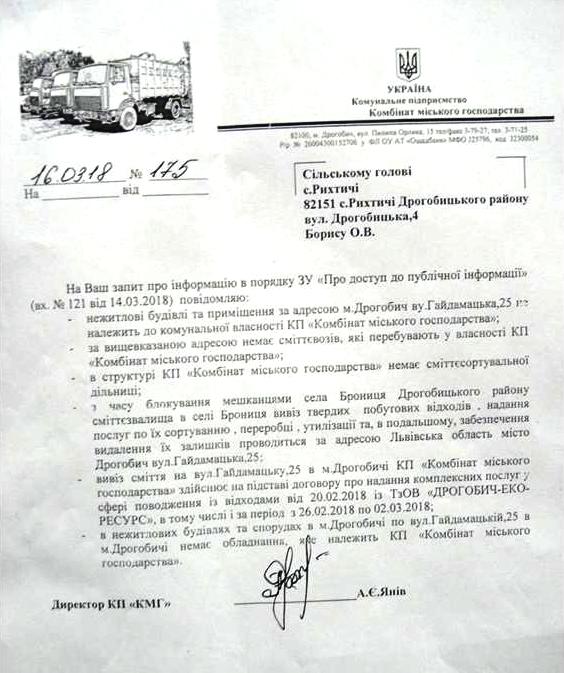 На запит Рихтицького сільського голови директор КП «КМГ» А. Янів відповів, що «в структурі КП «Комбінат міського господарства» немає сміттєсортувальної дільниці»(!!!), і з часу блокування сміттєзвалища в с. Брониця вивіз, переробка та утилізація сміття проводиться на вул. Гайдамацькій, 25, а також вивіз сміття на вул. Гайдамацьку, 25 КП «КМГ» здійснює на підставі договору з ТзОВ «ДРОГОБИЧ-ЕКО-РЕСУРС» від 20.02.2018.