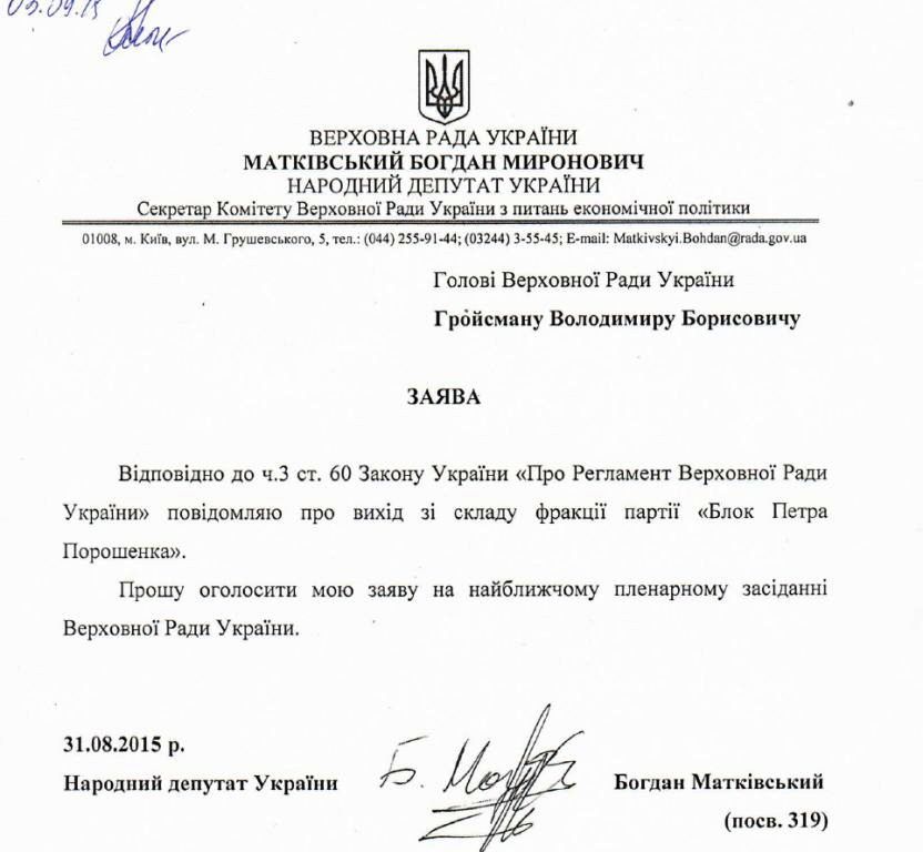 Народний депутат України від Дрогобиччини, член політради партії «Громадський рух «Народний контроль» Богдан Матківський заявив про намір вийти із парламентської фракції «Блок Петра Порошенка». Про це повідомляє прес-служба партії «Громадський рух «Народний контроль». Так,зокрема, Богдан Матківський уже подав відповідну заяву у Секретаріат на ім`я голови ВРУ Володимира Гройсмана.