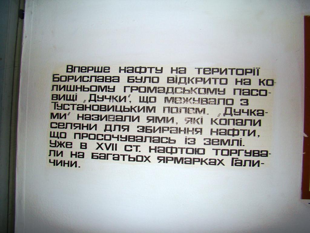 Борислав – єдине місто в світі, яке розміщене на промисловому нафтогазовому та озокеритному родовищі, де наявні численні джерела мінеральних лікувальних вод. На території міста діє 7 шкіл, державна гімназія, професійно-технічний ліцей, медичний коледж, школа мистецтв, два музеї (історико-краєзнавчий музей та музей нафти і газу). Інформацію взято з Вікіпедії.