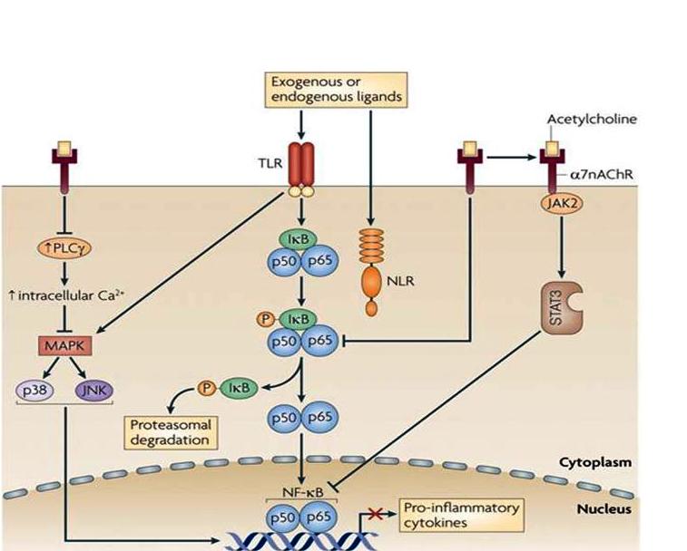 Щоб продовжити розгадку таємниці протизапальної дії Нафтусі, звернемось до сучасних відомостей про регуляцію запалення як одного із типових патологічних процесів. Ключовим чинником регуляції запалення вважають розміщені в селезінці, лімфатичних вузлах, лімфоїдній тканині слизових оболонок уро-генітального, дихального і травного трактів, печінці, шкірі і навіть у мозку макрофаги, які синтезують і виділяють прозапальні цитокіни (інтерлейкіни 1 і 6, фактор некрозу пухлин та інші). Сигналом для початку біосинтезу цитокінів служать чинники (ліганди) як зовнішнього, так і внутрішнього походження (детальніше про них згодом). Як видно на схемі (верхній рисунок), ці ліганди, зв’язавшись з відповідними рецепторами макрофага (екзогенні – з TL, ендогенні – з NL), запускають в цитоплазмі ферментативний каскад утворення або реактивації специфічних протеїнів (відповідно p38 і JNK та p50-p65), котрі, своєю чергою, поступають у ядро і активують гени, відповідальні за біосинтез прозапальних цитокінів. Описані процеси підлягають регуляторному гальмівному впливу низки протизапальних чинників. Таким є, зокрема ацетилхолін – медіатор парасимпатичної нервової системи. Зв’язуючись з мембранними N-холінорецепторами (точніше, з їх α7-субодиницею), ацетилхолін за посередництва специфічних протеїнів в кінцевому підсумку гальмує біосинтез прозапальних цитокінів, тобто чинить протизапальну дію.