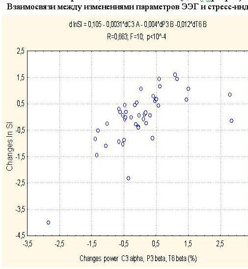 У 44 пацієнтів іншого контингенту ми разом з Т.А Королишин реєстрували одночасно електрокардіограму (вже згаданим комплексом “КардіоЛаб”) і електроенцефалограму (комплексом ”НейроКом”, теж придбаним за вказівкою П.П. Якубенка) до і через 1,5 год після вживання Нафтусі. У 25 (57%) осіб зареєстровано симпатотонічну реакцію, у 11 (25%) – ваготонічну реакцію, а ще у 8 (18%) осіб величина стрес-індексу Баєвського суттєво не відрізнялась від початкової (слід гадати, ця реакція є продовженням ранньої ваготонічної реакції, яка через 1,5 год вже сходить нанівець). Проаналізувавши супутні зміни так званої спектральної потужності (яка відображує амплітуду і частоту) основних ритмів ЕЕГ у 16 відведеннях (локусах), ми виявили, що симпатотонічна реакція на Нафтусю поєднується з суттєвим зниженням спектральної потужності альфа-ритму у лівому центральному і лівому лобному локусах та бета-ритму – у правому скроневому локусі і підвищенням спектральної потужності дельта-ритму у лівому лобному локусі. Натомість ваготонічна реакція на Нафтусю супроводжується протилежними змінами даних параметрів ЕЕГ, а нейтральна – проміжними. В цілому між змінами під впливом Нафтусі активності вегетативної нервової системи і окремих ділянок головного мозку існує тісний зв’язок. Це документовано так званим канонічним кореляційним аналізом (див. графік).