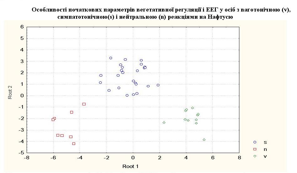 Особливості початкових параметрів вегетативної регуляції і ЕЕГ у осіб з ваготонічною (v), симпатотонічною(s) і нейтральною (n) реакціями на Нафтусю
