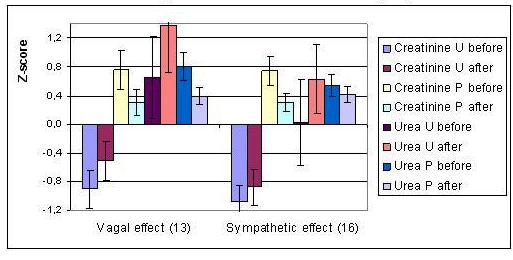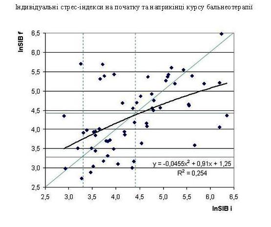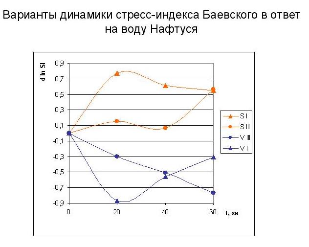 Серед дітей, котрі прибували на оздоровлення з теренів, забруднених радіонуклідами, було виявлено багато випадків вегетативної дистонії, переважно симпатотонії, рідко – ваготонії. Це ілюструється зміщенням точок вздовж осі абсцис вправо чи вліво від вертикальних штрихових ліній, які позначають межі зони норми стрес-індексу Баєвського. Після курсу пиття Нафтусі (правда, разом з іншими оздоровчими процедурами) виявлено зміни стрес-індексу, про скерованість яких свідчить розміщення точки відносно бісектриси (над – підвищення, під – зниження). В цілому, як можна судити за лінією регресії, внаслідок бальнеотерапії вираженість як симпатотонії, так і ваготонії зменшується, а нормальний вегетативний тонус підвищується в межах норми.
