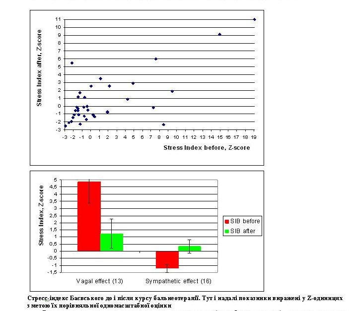 При персональному ж аналізі видно, що у 16 дітей з симпатотонією стрес-індекс знижувався, при цьому у 6 – до зони норми. Разом з тим, у 10 дітей симпатотонія навіть трішки посилювалась. З іншого боку, серед 6 дітей з ваготонією у 3 наступила ейтонія, ще у однієї вираженість ваготонії зменшилась, разом з тим, у однієї дитини ваготонія поглибилась, а ще у однієї – трансформувалась у симпатотонію. У дітей-ейтоніків під впливом бальнеотерапії однаково часто (по 6 випадків) розвивалась як ваготонія, так і симпатотонія, а у 16 зміни коливались в межах ейтонії. Механізм описаних змін полягає в тім, що в нормі при активації симпатичних нервових центрів останні активують симпатоінгібіторні центри, і навпаки, активація вагальних ядер підвищує симпатичний тонус. Однак при вегетодистонії цей механізм контррегуляції не спрацьовує.