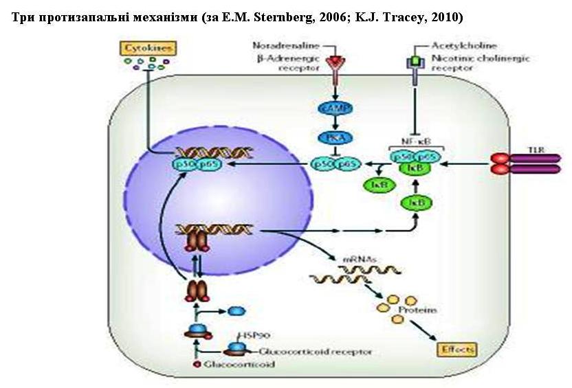 Три протизапальні механізми (за E.M. Sternberg, 2006; K.J. Tracey, 2010)