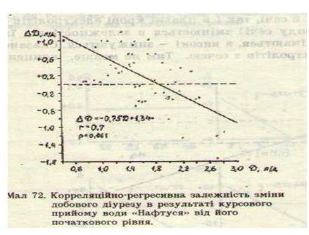 Натомість В.П. Балановським у 1992 р. було показано, що спрямованість і величина змін добового діурезу у хворих на уролітіаз визначаються не дозою Нафтусі, а початковим рівнем діурезу. Як видно на графіку, запозиченому з колективної монографії “Вода Нафтуся і водно-сольовий обмін” (1997), закономірний приріст добового діурезу спостерігався, як правило, у хворих з його початковим рівнем, нижчим від 1,44 л; у осіб з діурезом в межах 1,5-2,3 л/добу зміни були незакономірні, а у випадках початкового сечовиділення 2,4-2,8 л/добу в кінці курсу пиття констатовано його закономірне зменшення. В середньому у 60% хворих добовий діурез зростав з 1376 мл на 526 мл (38%), а у 40% – зменшувався з 2038 мл на 518 мл (25%). Така ж закономірність виявлена стосовно концентрації в добовій сечі і екскреції електролітів: натрію, калію, кальцію, магнію, хлориду, фосфатів, що дало підстави В.П. Балановському і І.Л. Поповичу сформулювати концепцію про амбівалентно-еквілібраторний характер дії лікувальної води Нафтуся. Суть концепції полягає в тому, що дія води Нафтуся на параметри водно-сольового обміну різноспрямована (амбівалентна), при цьому напрям дії визначається вихідним рівнем параметру: при низькому рівні дія стимулююча, а при високому – гальмуюча, тобто характер дії є нормалізуючим, вирівнюючим (еквілібраторним).