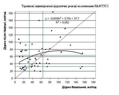 Аналогічна закономірність виявлена і при порівнянні об’ємів сечі, виділених впродовж години до і після вживання Нафтусі в дозі 0,3% (3 мл/кг маси тіла). На наступному графіку видно, що виділення сечі зростає у всіх хворих з початково зниженим спонтанним діурезом, тоді як серед осіб з нормальним діурезом частість діуретичних і антидіуретичних реакцій на Нафтусю практично однакова, а у випадках початково високого діурезу частіше спостерігаються антидіуретичні реакції. При цьому швидкість діурезу знижується лише до зони норми.