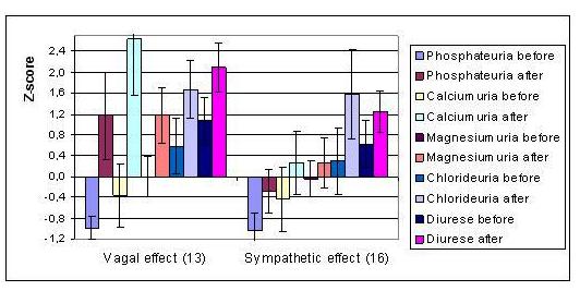 Разом з тим, виявлено, що ваготонічний ефект бальнеотерапії супроводжується реверсією гіпофосфатурії у гіперфосфатурію та збільшенням початково нормальної екскреції хлориду, магнію і, особливо, кальцію, тоді як за симпатотонічного ефекту зростає екскреція лише хлориду і, меншою мірою, фосфатів.