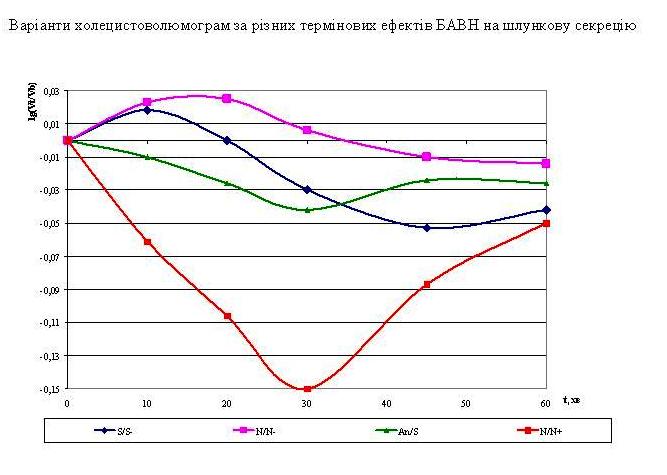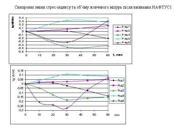 При синхронній реєстрації годинної динаміки стрес-індексу Баєвського і об’єму жовчевого міхура після вживання стандартної дози Нафтусі (3 мл/кг) у 20% хворих на хронічний холецистит (ряд 5) міхур швидко скорочувався, зменшуючись на 30-й хвилині на 47%, тобто інтенсивно виділяючи жовч, з наступним поступовим відновленням об’єму. Така холецистокінетична реакція супроводжувалась ваготонічною реакцією вегетативної нервової системи. У 27% хворих (ряд 3) міхур скорочувався повільно і лише до 66% початкового об’єму, але залишаючись в такому стані до кінця годинної реєстрації, що зумовлено затяжним ваготонічним ефектом Нафтусі. Ще у 15% осіб (ряд 1) констатовано в’яле скорочення міхура, що супроводжувалося пізньою ваготонічною реакцією на Нафтусю. Отже, три варіанти холецистокінетичного ефекту Нафтусі мають місце лише у 61% хворих. Натомість у решти осіб об’єм жовчевого міхура майже не змінювався (ряд 2) чи навіть збільшувався (ряд 4), що зумовлено симпатотонічними ефектами Нафтусі. Але ж і в даних випадках запускається протизапальна адренергічна реакція, що і потрібно при хронічному холециститі!