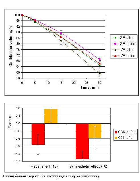 Знову повертаючись до попереднього спостереження, відзначимо, що курс бальнеотерапії посилює скоротливу реакцію жовчевого міхура на стандартний холекінетик (розчин ксиліту). При цьому за ваготонічного ефекту гіпокінезія міхура переходить навіть у незначну гіперкінезію, тоді як за симпатотоніччного має місце лише зменшення вираженості гіпокінезії.