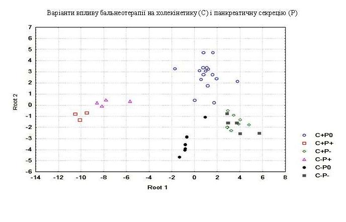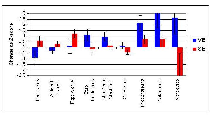 Застосувавши дискримінантний аналіз, ми виявили саме ці показники, сукупність змін яких характерна для альтернативних вегетотропних ефектів бальнеотерапії. Ними є (див. рис.): відносний вміст в крові активних Т-лімфоцитів, еозинофілів і, особливо, моноцитів, які змінюються різноскеровано; симпатозалежне зниження кальційемії і підвищення лейкоцитарного індексу адаптації Поповича та вагусзалежне підвищення вмісту паличкоядерних нейтрофілів, інтенсивності фагоцитозу, а також екскреціїї фосфатів і кальцію.