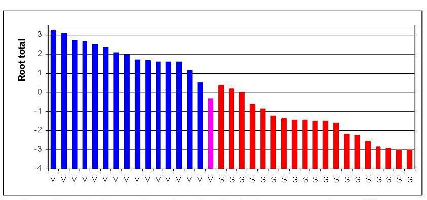 Індивідуальні канонічні дискримінантні корені пацієнтів, підлеглих ваготонічному (V) чи симпатотонічному (S) ефекту бальнеотерапії