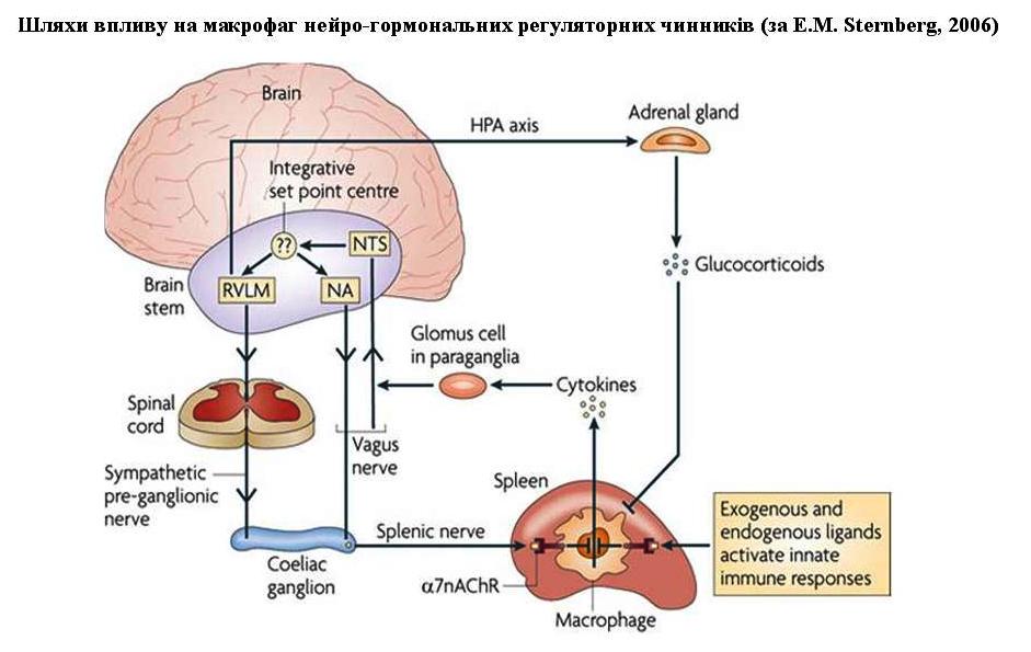 З’ясувавши, що відбувається всередині макрофага після активації його рецепторів, перейдемо від клітинного рівня до системного, тобто до з’ясування шляхів впливу на макрофаг вегетативної нервової і гіпоталамо-пітуїтарно-адреналової (НРА) систем.