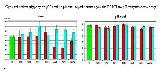 У цих же хворих одночасно реєстрували зміни годинного діурезу. Виявилось (лив. діаграму), що у всіх хворих з анацидністю, поєднаною зі зниженим базальним діурезом, Нафтуся чинить відчутний діуретичний ефект. Разом з тим, діуретичний ефект Нафтусі, але менш виражений, констатовано і у нормацидних хворих з нормальним спонтанним діурезом. В цілому, частість діуретичного ефекту Нафтусі становить 66%. При цьому має місце незначне залужнення сечі.