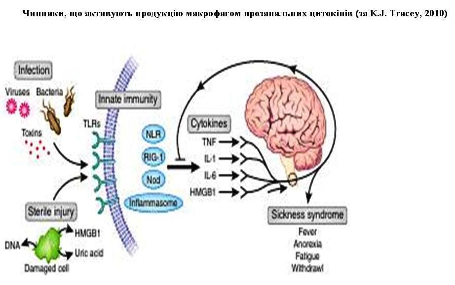 Тепер наступила черга анонсованої деталізації екзогенних і ендогенних лігандів макрофагів. Екзогенними лігандами, які зв’язуються з поверхневими (мембранними) TL-рецепторами макрофага, є віруси, бактерії та їх токсини (див. схему). За іншими даними, з TL-рецепторами зв’язуються не лише живі мікроорганізми, а й їх “уламки” (ліпополісахариди і ліпотейхоєва кислота клітинної мембрани, деякі протеїни, РНК, ДНК), а також крупномолекулярні органічні речовини, зокрема нафтоподібні. Ендогенними лігандами, які зв’язуються з цитоплазматичними NL-рецепторами, є, зокрема, інтерлейкін-1α і сечова кислота. Як видно на схемі, перелічені ліганди здатні через посередництво прозапальних цитокінів впливати на ЦНС з розвитком так званого синдрому слабості (sickness) з лихоманкою, відсутністю апетиту, втомою тощо. Але це за умови їх масованого впливу на макрофаги (інфекція, ішемія і некроз тканин, їх травма). Знову звертаю увагу на негативний зворотний зв’язок, тобто гальмування цитокінами утворення самих себе.