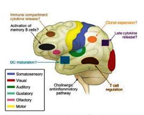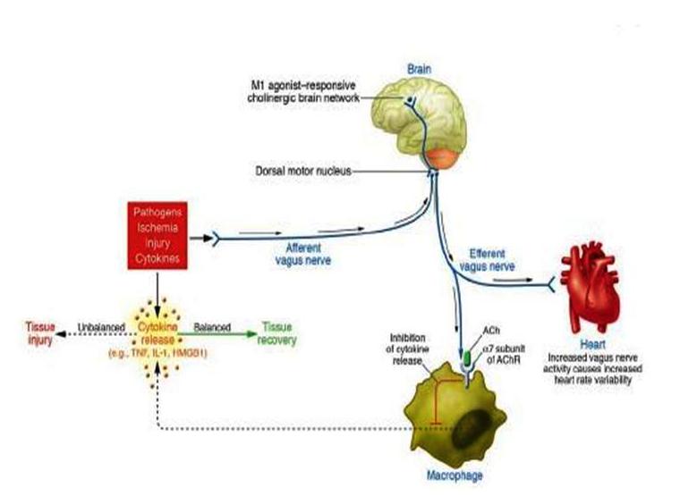 Це положення продубльоване на наступній схемі. Разом з тим, на ній показано, що нервові імпульси, викликані цитокінами, поступають по розгалуженнях блукаючого нерва одночасно до макрофагів, серця та інших іннервованих ним органів (шлунка, жовчевивідних шляхів, підшлункової залози тощо), а також у ЦНС. Сукупність процесів дістала назву холінергічний протизапальний рефлекс.