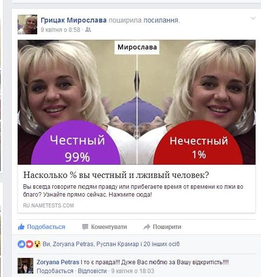 Так от, пройшла цей тест і лікар Мирослава Грицак. Результат виявився вражаючим – чесність пані Мирослави незалежна експертна програма визначила аж в 99%! Цим результатом Мирослава Грицак поділилася на особистій сторінці в мережі Фейсбук, але тільки зі своїми друзями. Бачити цей результат інші користувачі не можуть. Так що до позитивних рис лікаря крім чесності додається ще й скромність.