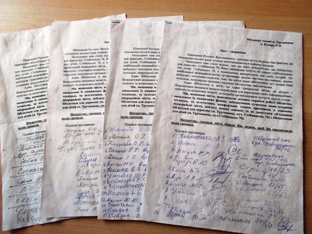 Надалі тривають спроби міської влади вигнати з свого приміщення бібліотеку. Оскільки попередні спроби не увінчалися успіхом, покликали на допомогу депутатів. Так, на останній сесії цікаву пропозицію подав депутат Євген Юник. Лишень зараз, під закінчення своїх каденцій, напередодні виборів, наша влада та деякі депутати терміново взялися вирішити всі квартирні соціальні питання воїнів АТО. Мабуть, забули, що війна йде вже півтора року і часу було більш ніж достатньо. Чи навмисно притримали цю тему до виборів, щоб було на чім попіаритись? Але що варте голосування купки депутатів проти волі та голосу громади у 253 голоси (фото додається)?