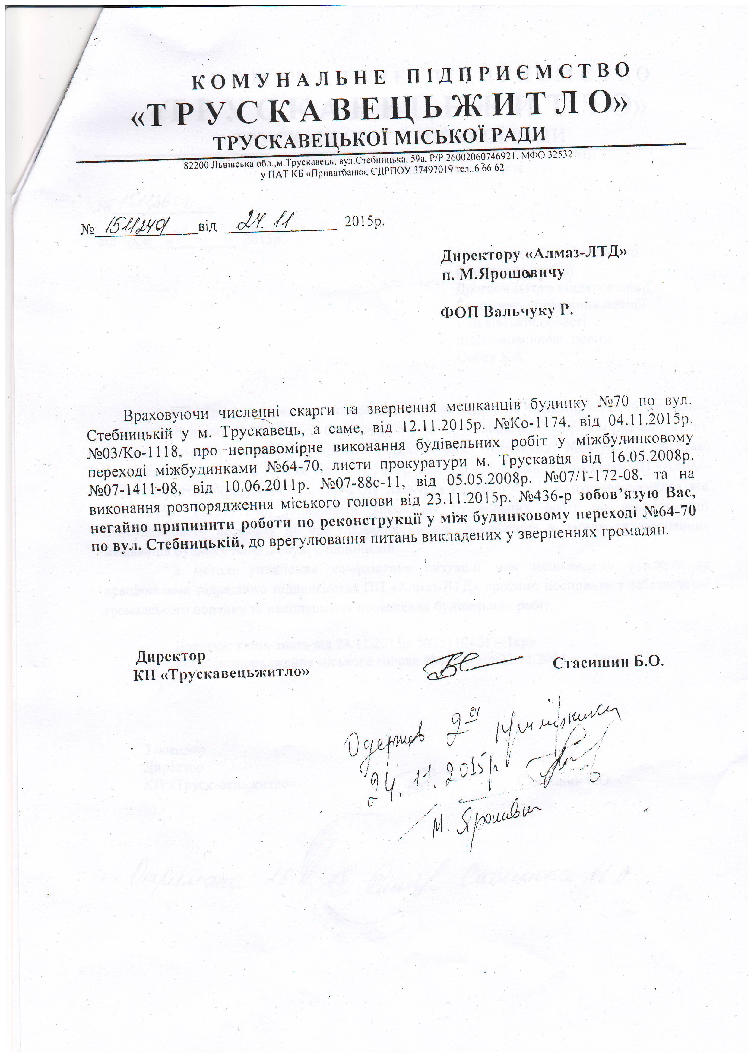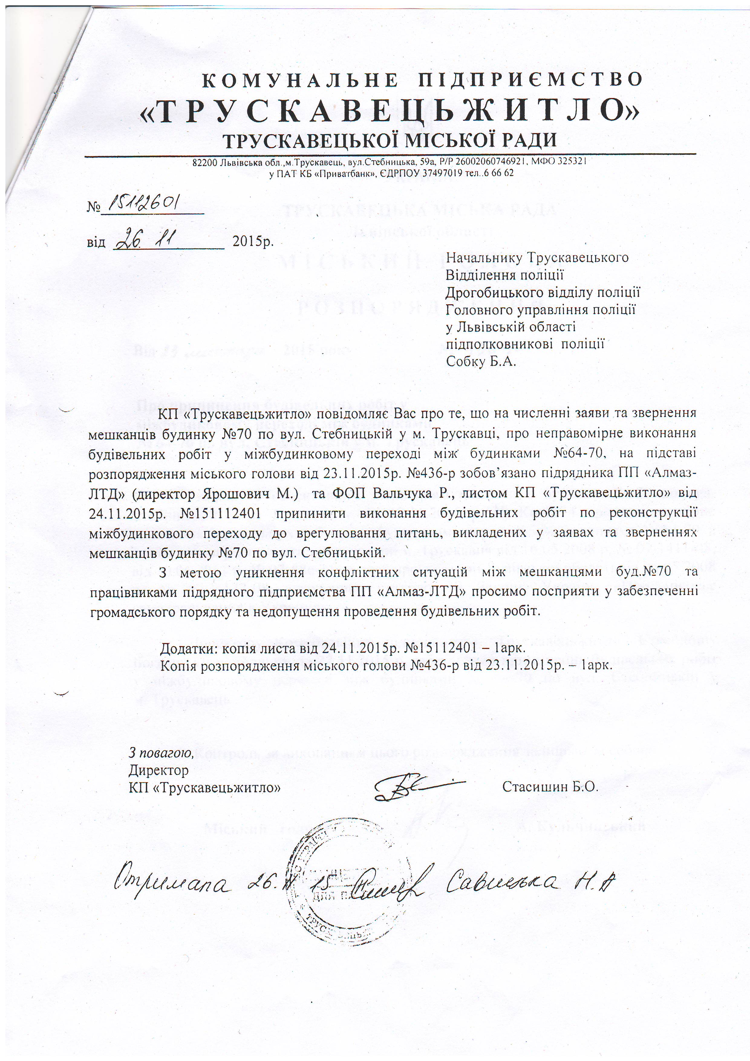 Мешканці будинку по вул.Стебницька, 70 повідомляють про те, що розпорядження новобраного міського голови А.Кульчинського про призупинку забудови міжбудинкового проходу не виконується. Вони неодноразово викликали поліцію, яка приїзджаючи повідомляла робітників про те, що є розпорядження про призупинку робіт та їхала геть не здійснюючи ніяких дій. Мешканці звернулись за юридичною підтримкою до Адвоката Анатолія Мацея, який взявся за їхню справу та підготував позов до суду. В середу 2 грудня 2015 р. справа буде розглядатись.