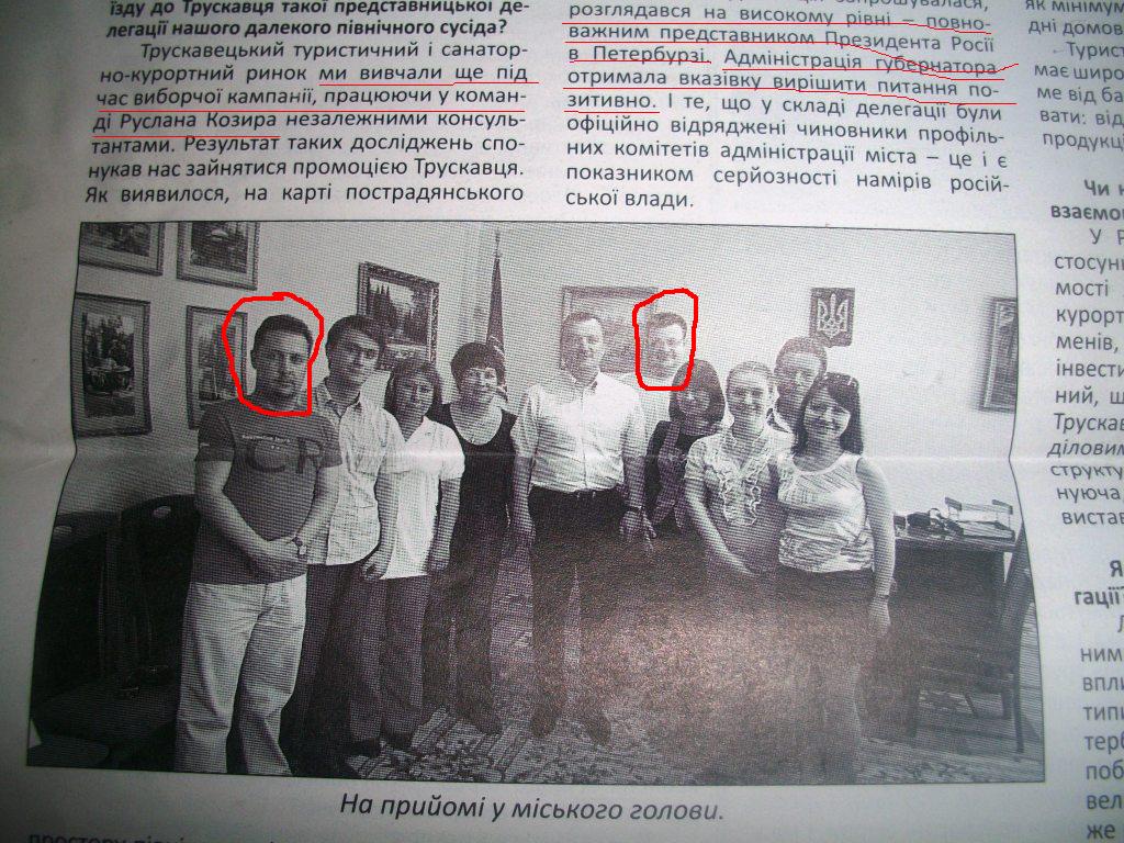 «Наше місто-курорт все частіше відвідують делегації з ближнього і дальнього зарубіжжя. Днями Трускавець приймав поважних гостей із Санкт-Петербургу. Організували приїзд російської делегації Дмитро Перев`язкін і Павло Мезерін – керівники офіційного представництва Трускавця у Санкт-Петербурзі, відкритого за підтримки Президента Російської Федерації і губернатора міста на Неві…».