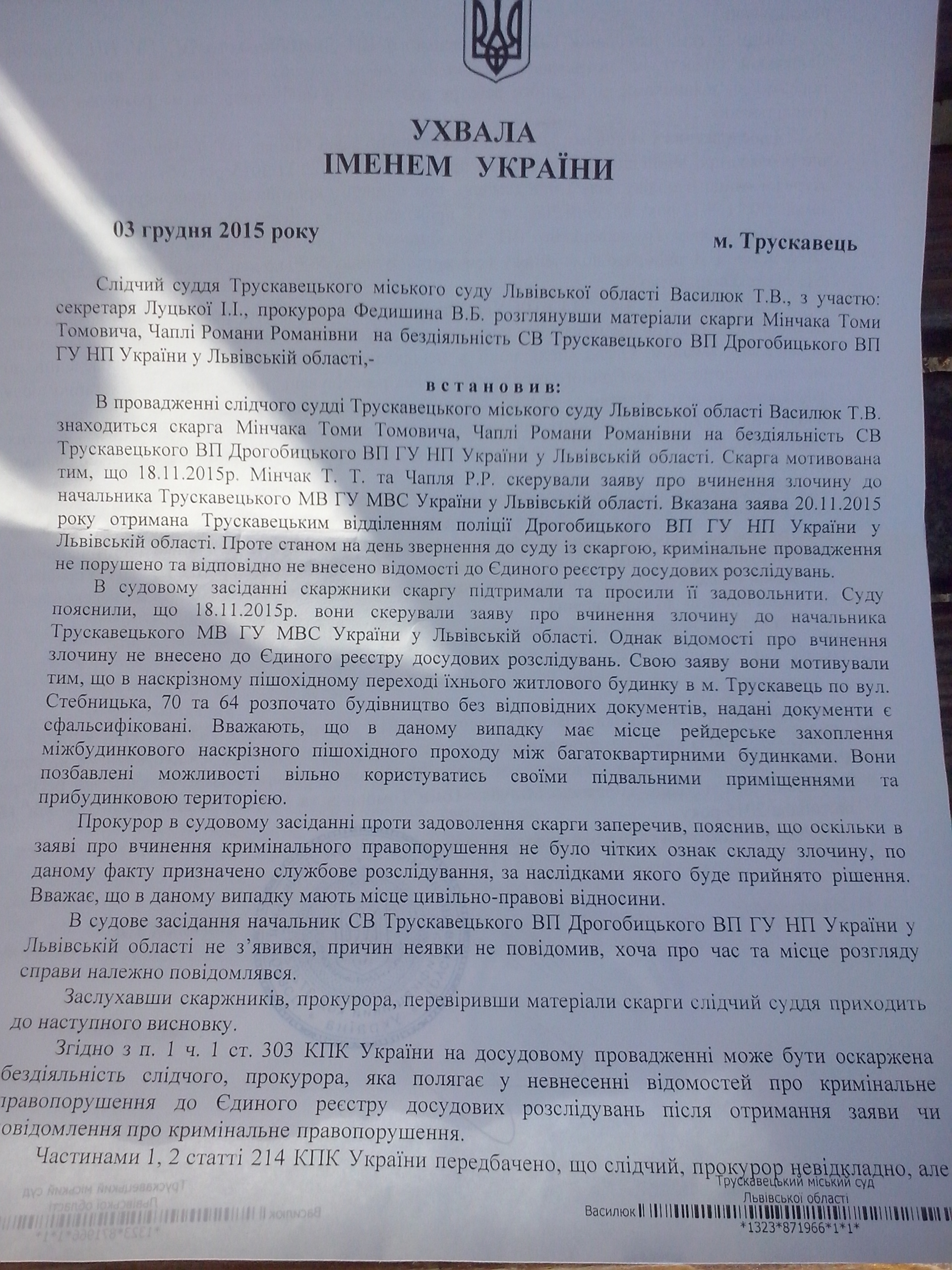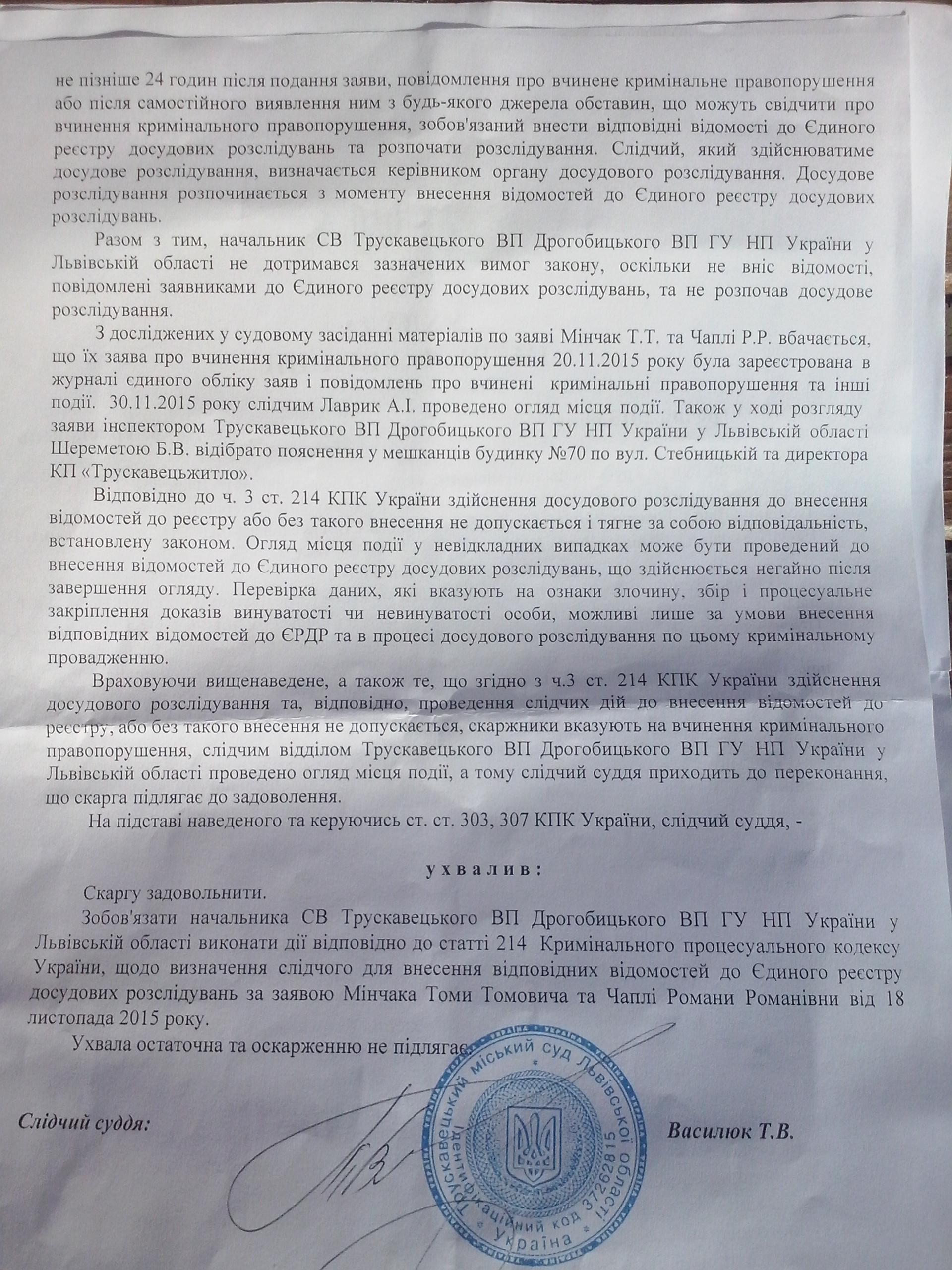 Слідчий Суддя Василюк Т.В. іменем України виніс Ухвалу, скаргу позивачів (Мінчака ти Чаплі) задовільнити та зобов’язати начальника СВ Трускавецького ВП Дрогобицького ВП ГУ НП України у Львівській області виконати дії щодо визначення слідчого для внесення відповідних відомостей до єдиного реєстру досудових розслідувань.