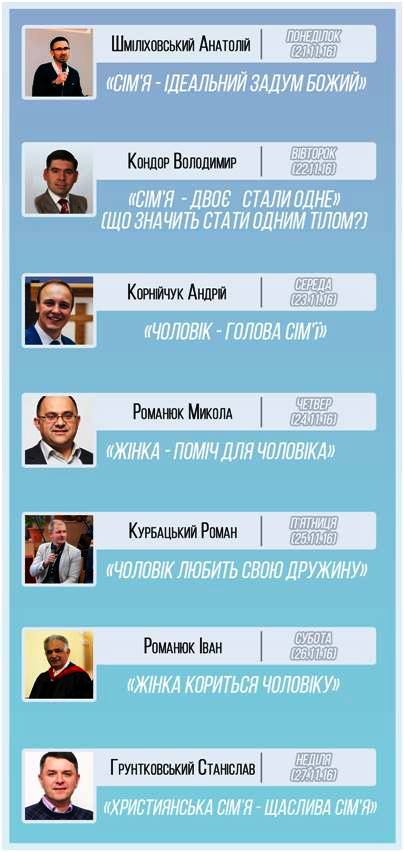 Чи можна вирішити сімейні проблеми і як? Наступного тижня кожного дня проходитимуть зустрічі, які допоможуть сім`ям краще зрозуміти причини їхніх проблем, виправити помилки, зрозуміти свою роль, свою місію, своє покликання в подружжі.