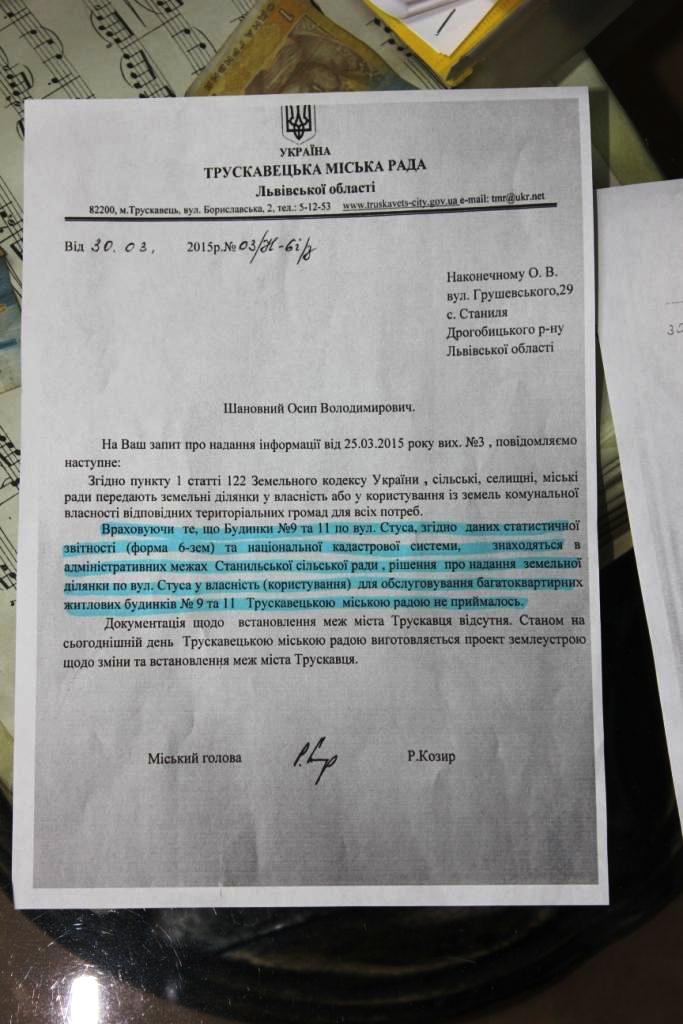 Тепер варто розібратись в тих питаннях, що стосуються прибудинкової території. Громада будинку на Стуса 9 стверджує, що Наконечний забрав у них прибудинкову територію та майданчик, який колись був перед будинком. Але, як би мені не хотілось підтримати людей, на жаль, реальний стан справ зовсім не такий. Офіційні відповіді, надані Трускавецькою міською радою та Станильською сільською радою, говорять про те, що прибудинкова територія не була і не є закріплена за будинком. Представники громади просто не звертались до відповідних інстанцій та не добились закріплення за ними цієї території. Хоча пан Герльовський переконує мешканців дому в протилежному.