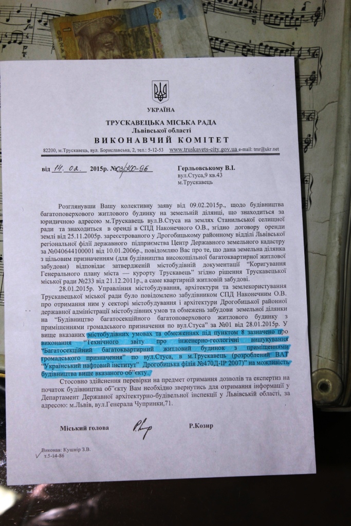 Мешканці житлових будинків впевнені, що замовник будівництва – Наконечний Осип Володимирович та його син, депутат Трускавецької міської ради Наконечний Володимир Осипович не мають належних дозволів на будівництво або проводять його з грубими порушеннями. Та найбільший страх у них викликає те, що ця ділянка може містити під поверхнею пустоти, які згодом будуть провокувати зсуви та провали ґрунту, а разом із ним і житлових будинків.
