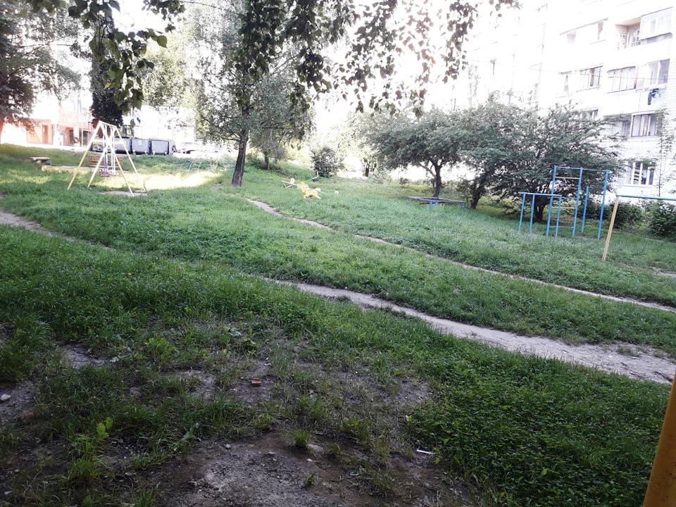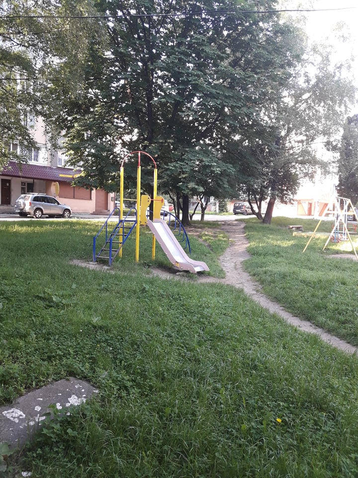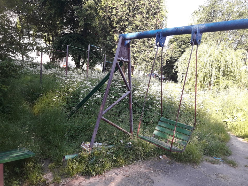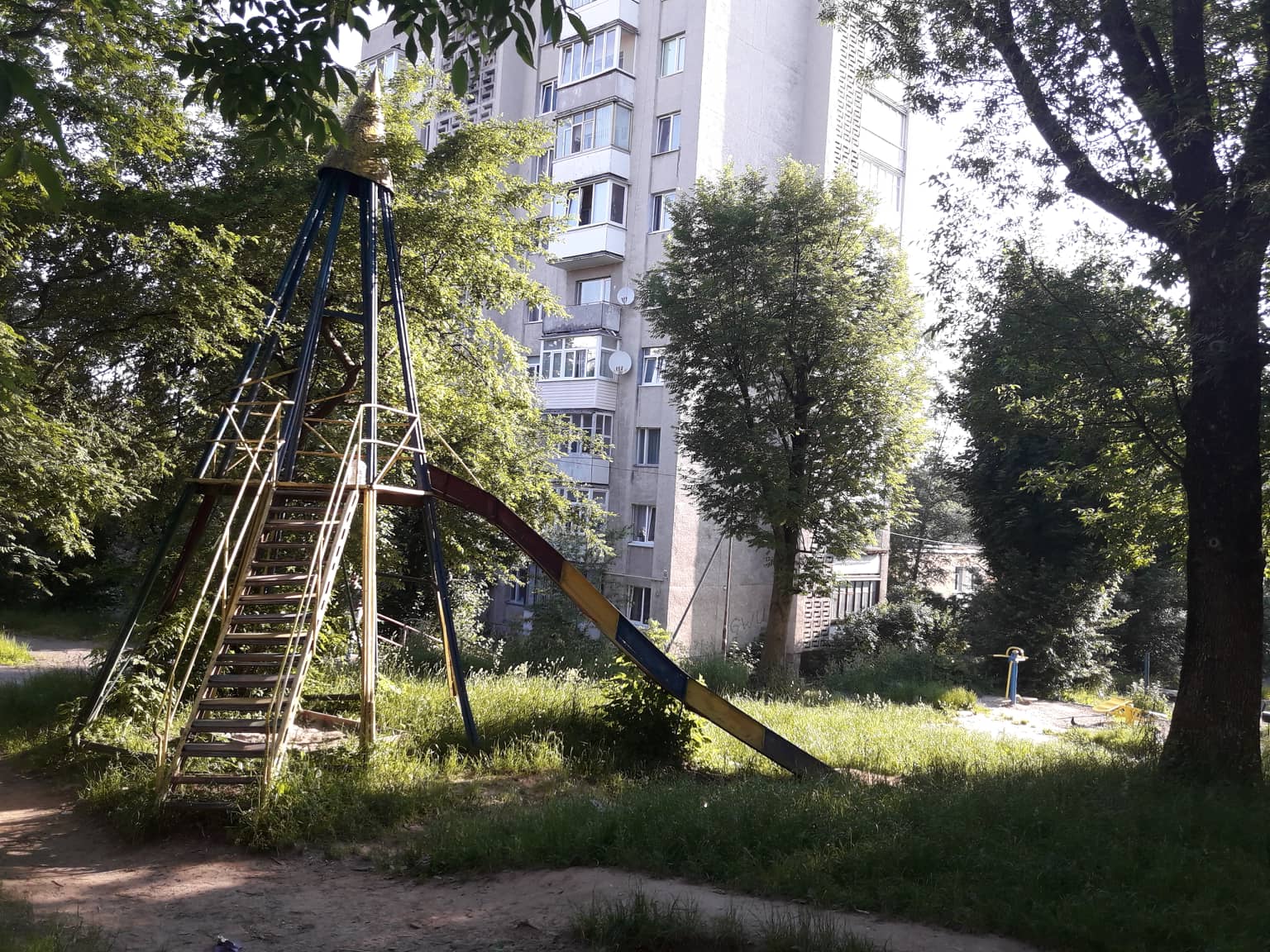 Але є й такі занедбані площі забав, що заходити на них страшнувато не тільки дітям, а й дорослим. У високій траві щось шелестить чи сичить, незмащені поіржавілі металеві конструкції скриплять під подувами вітру, а гойдалка на одному кріпленні хитається і наче запрошує до небезпечних екстремальних випробувань. Одним з таких непривабливих «майданчиків» є територія біля Івасюка, 1 та 1-А.
