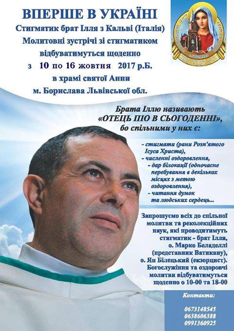 Як інформує прес-служба Львівської ОДА, з 10 до 16 жовтня у місті Бориславі у храмі святої Анни відбуватимуться міжнародні молитовні зустрічі зі стигматиком Іллею Катальдо з Італії. У програмі зустрічей – Святі Літургії, реколекції та зустрічі з воїнами АТО, які перебувають на реабілітації в госпіталях.