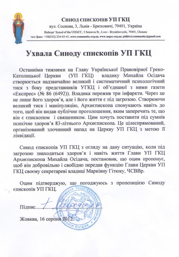 ⁷² Ухвала Синоду єпископів УП ГКЦ // Українська Правовірна Греко-Католицька Церква, 17.08.2012