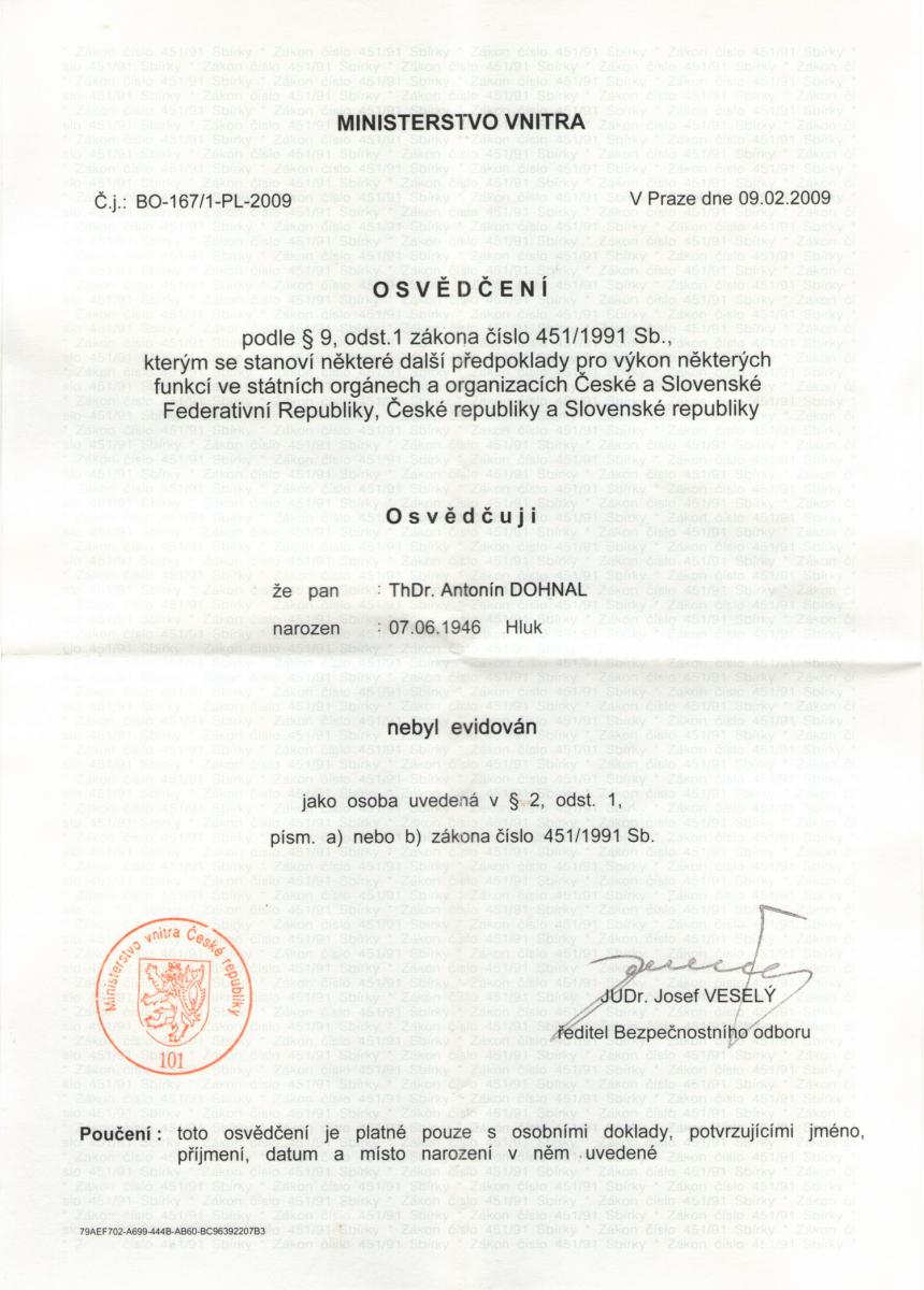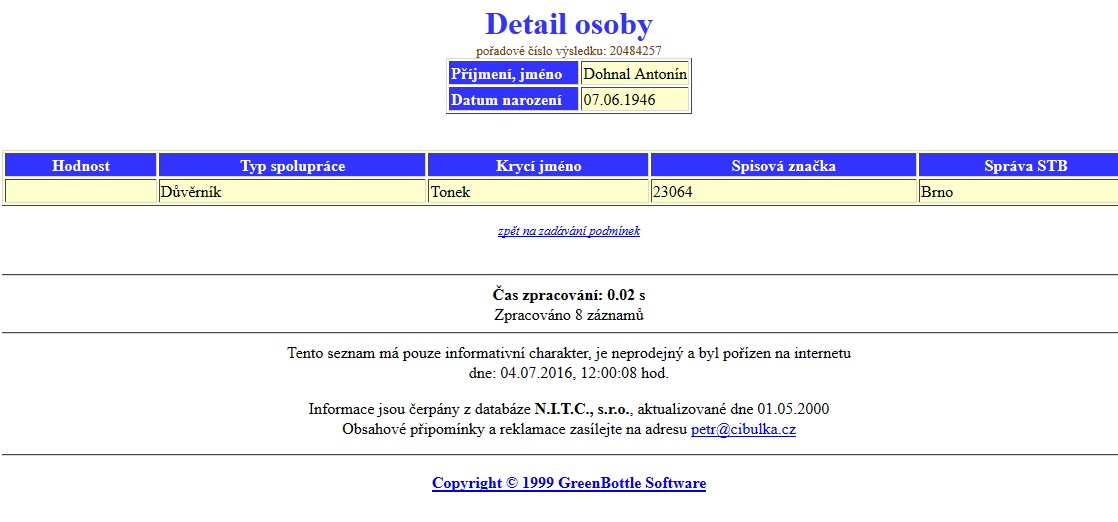 У розпалі «антидогналітської» баталії арґумент про Антоніна Догнала – агента комуністичних спецслужб діяв безвідмовно. Але ніхто з полемістів – як це воно й буває в умовах à la guerre comme à la guerre – не обтяжував себе посиланням на першоджерела. А воно ж цікаво… Єдине, що вдалося знайти самому – чеський сайт отого Петра Цибулки, на якого всі посилаються. Нібито сторінка досьє конфідента чехословацьких спецслужб Антоніна Догнала ⁸³.