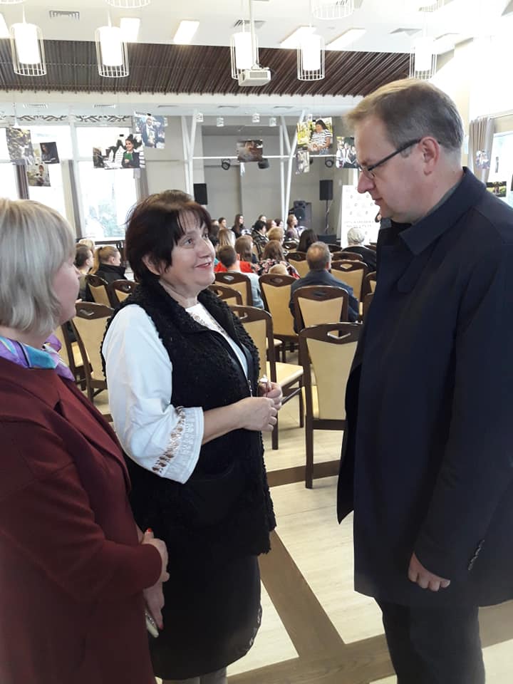 На першому поверсі готелю триває книжковий ярмарок, де представлені і книги Мирослава Дочинця, і наші земляки – дрогобицьке видавництво «Коло» в особі пана Андрія Дудка, і де можна було побачити лауреата Шевченківської премії Василя Шкляра під час розмови з мером Трускавця Андрієм Кульчинським.