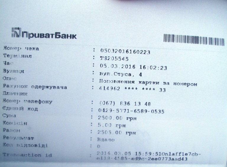 – для поповнення у відділеннях ПАТ КБ «ПриватБанк»: