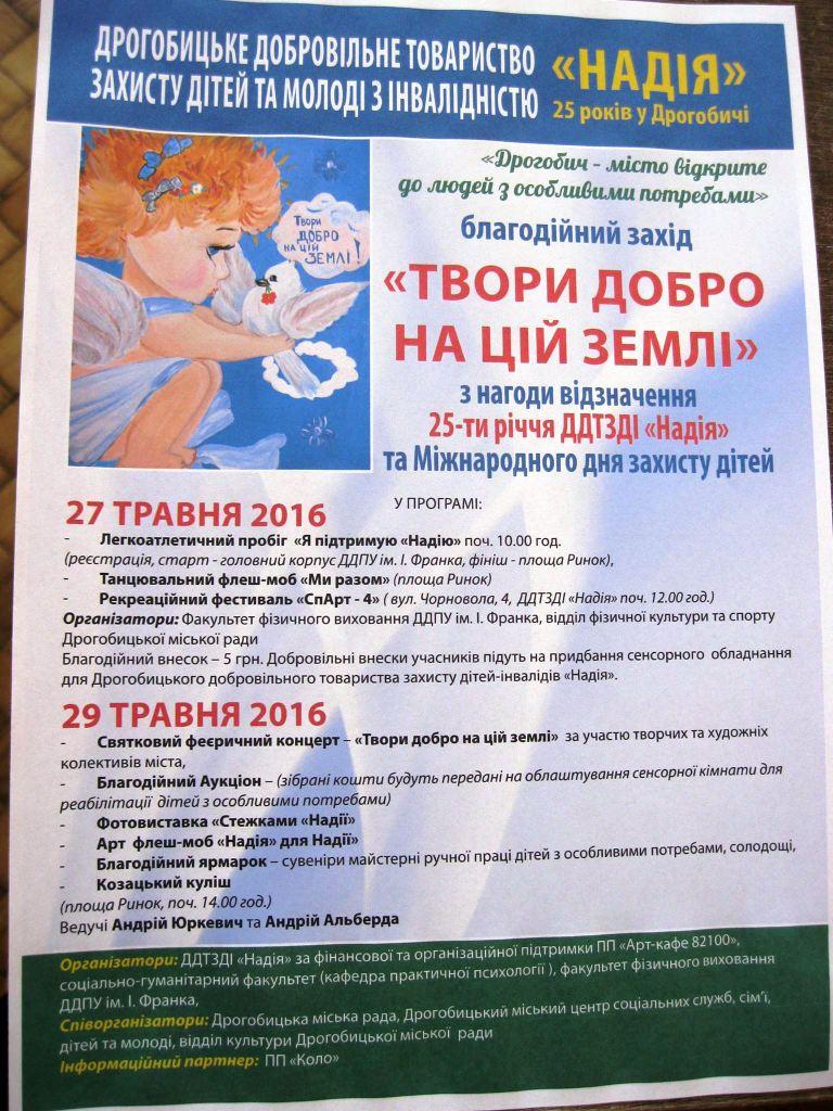 Дрогобицьке добровільне товариство захисту дітей-інвалідів «Надія» (керівник Ірина Дзюрах) відзначає свій чвертьвіковий ювілей. З нагоди 25-ліття існування ДДТЗДІ «Надія» та до Міжнародного дня захисту дітей в місті Котермака пройде благодійний захід «Твори добро на цій землі». Основні події заходу відбуватимуться у п’ятницю та неділю.