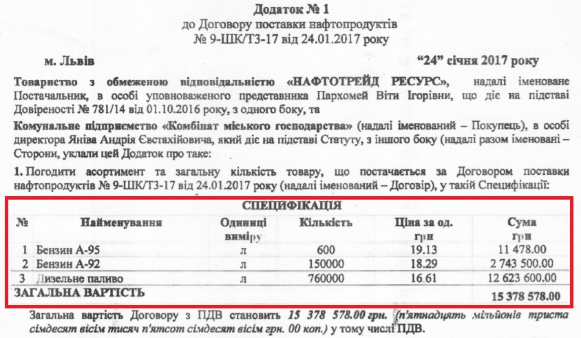 Цей факт виявили партнери «НГ. Львів» з «Центру громадського моніторингу та досліджень». Так, комунальне підприємство здійснило закупівлю пального 600 л бензину А-95, 150 тис. л бензину А-92, 760 тис. л дизпалива. На торги подали пропозиції дві фірми: ТОВ «Нафтотрейд Ресурс» з ціною пропозиції майже 15,4 млн грн та ПП «ОККО-Бізнес Контракт» з ціною понад 18 млн грн. Договір підписали з дешевшою фірмою.